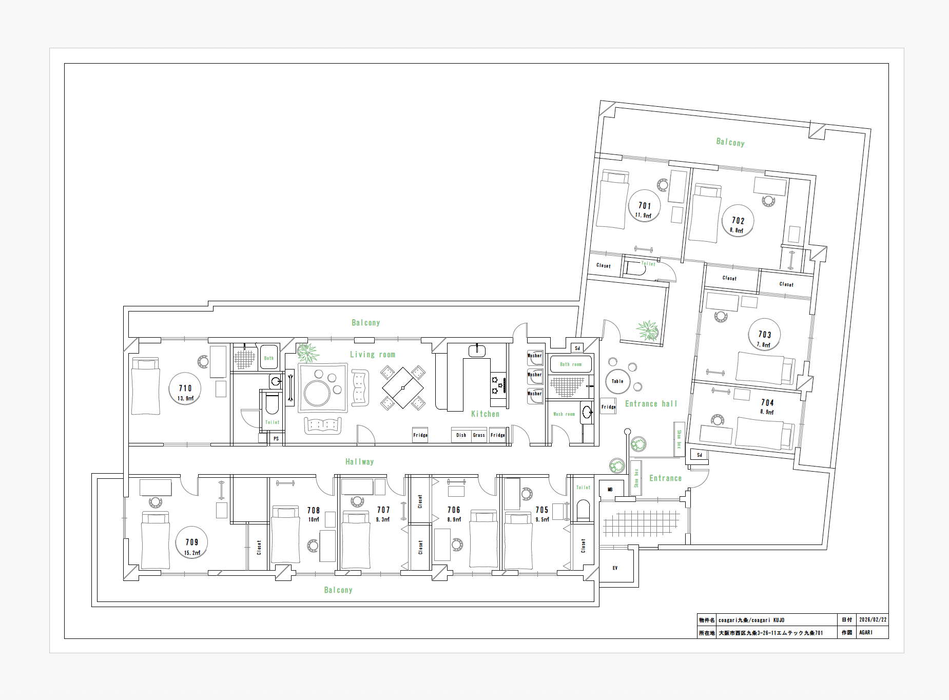 | 〇 | 709 | 15.2㎡ / 洋室 | ¥ 41,000 | ¥ 14,000 | ¥20,000 |